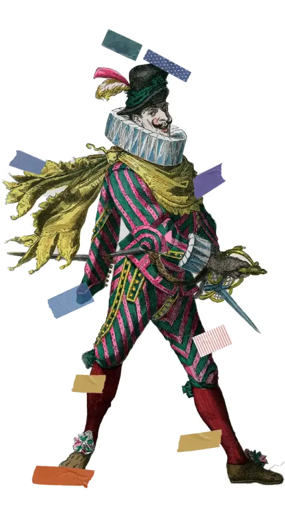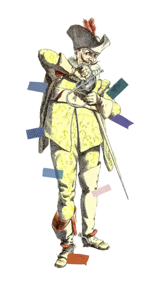 Chapeau à panache, loooongue rapière. Souvent habits tape-à-l’œil, médailles, etc.